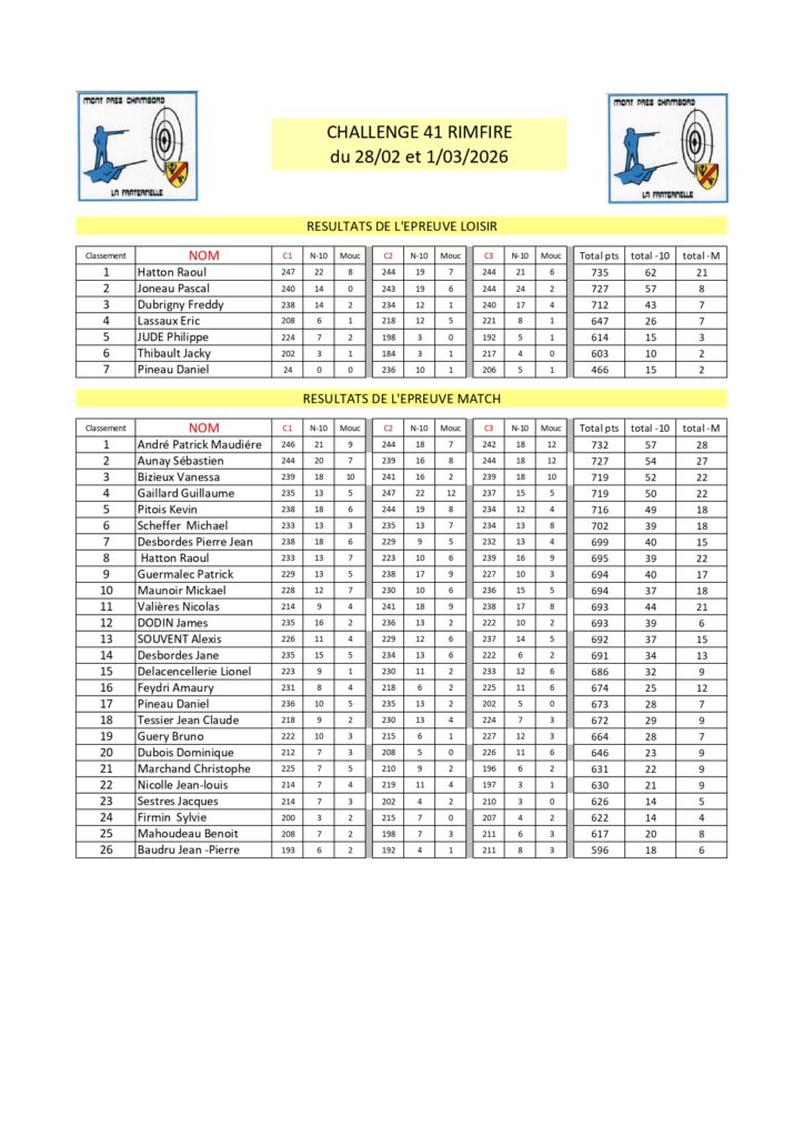 RESULTATS DE NOTRE COMPETITION AMICALE RIM FIRE DES 28/02 ET 1/03